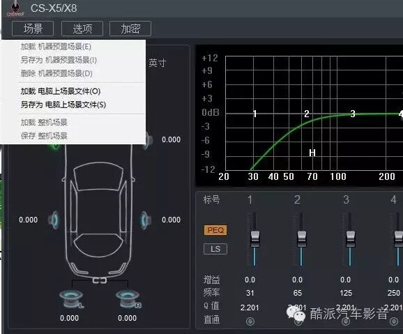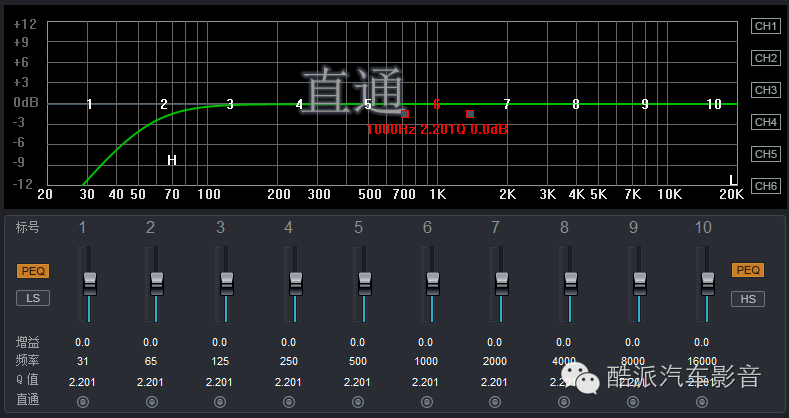 CS-X8是10段浮点EQ,10段的频率点可任意选择,并可调整电平值、Q值,Q值的调节范围在0.4-28,数值越大,频带越窄,意思是所影响的频率范围越小。选恢复均衡/直通均衡功能可快速对比试听调整和不调整之间的差别;重置均衡功能将均衡重新归零。