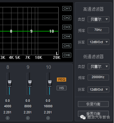 1、分频器的设置 在选择了声道后,根据声道配置选择分频网络,CS-X8对每个声道都有高通与低通滤波网络设定,分频斜率可选6或12dB/Oct.,不可关闭。分频类型有(贝赛尔Bessel,巴特沃斯Butterworth、宁克Linkwitz)三种,而三种类型是分频点的Q值有所不同(分别为0.58,0.7和0.5),汽车音响里通常选择巴特沃斯类型。分频点的频率值可选择相应的频率点,手动输入或鼠标滚动选择。