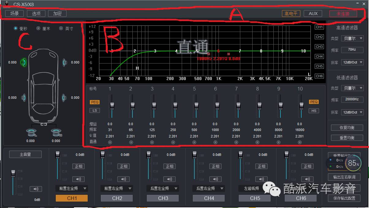 CS-X8的操作界面最大的特色是纯中文单页面操作,初学者经过简单培训和练习便可操作使用。电脑操作软件界面主要功能分三部分,1.音源输入方式、调试好文件的调用与存储。2.声音的延时调校、音量调节及静音、声道相位调节。3.每个声道的电子分频、EQ设置。