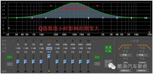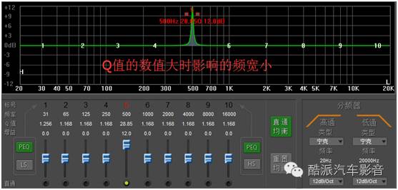 3、Q值:DSP软件中Q值的作用,如下图,以500HZ为例,当Q值数值增大时500HZ处影响的范围减小;当Q值减小时500HZ处影响的范围增大。