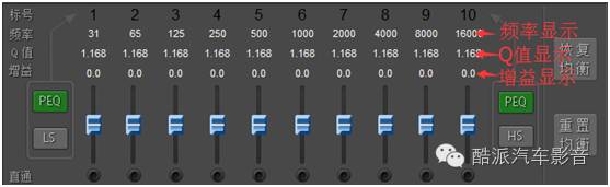 交叉火力DSP产品为了适应大众消费的快速安装需要特意设定了十段均衡的浮点可调机制。浮点即为十段均衡每段的频率都可以自由的调整;Q值即为调整某一个点的频率时调整这个点所影响的频率范围的大小,Q值的数值越小影响的范围越大、Q值的数值越大影响的范围越小。音响系统中并不是每个频点都需要作出修改的,合理的运用每个频点的增益、浮点、Q值能更好的调试出好的效果。后面将做详解。