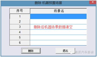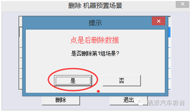 此功能是将机器中已存的数据删除,机器中存着的数据有时会改动,那么久会存在删除多余的数据,步骤如下:场景》删除机器预置场景》选择需要删除的数据名称》点击删除》点击是》数据预存在机器中的数据被清空,此机器是能存储6个模式方便使用的,当用户所需求的模式太多时就需要删除功能。