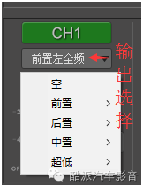 此区域为机器的输出配置区域和机器上的标示对应,不同的系统可以通过修改此区域的输出配置来实现,某个通道相位整体反相时也可通过此区域调节,但音源信号的反相时调节此区域是没用的,必须调节输入部分的喇叭线。输入部分反相既喇叭线接反表现出