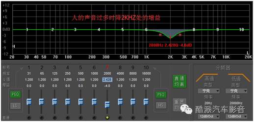 如上图,假如听音的系统中人的声音过多盖过了音乐的声音则可以降低2KHZ处的增益来做修饰。