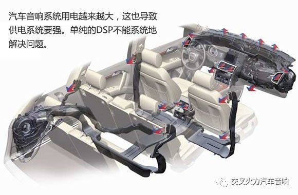 汽车的电源部分是由发电机和蓄电池(电瓶)组成,汽车没有启动时由电瓶提供电能,但它的首要设计目的是为了启动引擎,因此是可以瞬间提供大电流,但电压也会瞬间下降2-4V,这也是许多音响系统在汽车启动时突然“失声”的原因。在引擎启动发电机开始工作后,发电机通常稳定输出13.8V左右的电能。许多使用专车专用线束的DSP功放,由于内部并没有升压电路,因此提供的最大可能的功率输出也只有47W左右(4欧负载)。根据一般喇叭的灵敏度90dB(已经算高的了)来计,它的最大输出动态也只能达到105dB左右,这远远不够现在的高清音乐等远超110-120dB的大动态输出。这也是为何许多DSP处理器功能有了,但效果并不特别明显的原因。