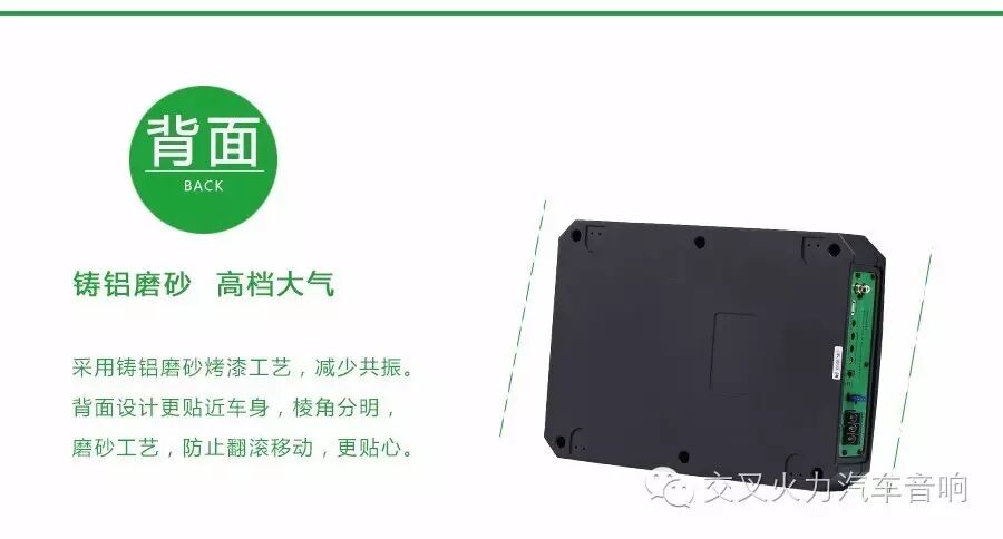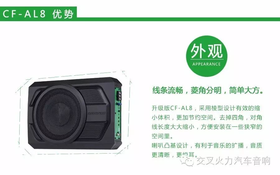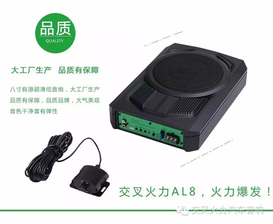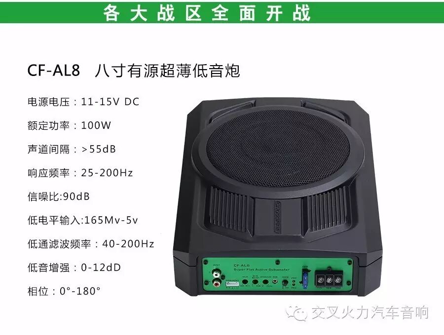 交叉火力CF-AL8八寸超薄有源低音炮,采用独家私模首先从外观上看就难掩其动感十足的魅力,与交叉火力专车专用DSP功放抢眼的绿色相得益彰。超薄小钢炮AL8采用压铸铝的金属外壳,减小共振;双音圈设计,采用高品质的AB类功放驱动,额定功率120W,25-200Hz的频率效应范围,低频下潜深。